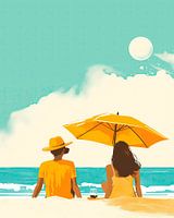 "Onder de Zon" is een sfeervol kunstwerk dat een stel toont dat ontspant onder een gele parasol aan het strand. De zachte pasteltinten van de lucht en de zee, gecombineerd met het heldere geel van de parasol en kleding, creëren een harmonieus en vredig beeld. De minimalistische compositie benadrukt de eenvoud en rust van het strandleven, perfect om een zomerse sfeer in huis te brengen.