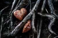 tussen de wortels van een op een talud groeiende boom hebben zich schimmels ontwikkeld tot rode glimmende paddenstoelen. Een ervan lijkt op een hartvorm, de ander op een half Venetiaans masker. Dit unieke natuurbeeld stamt uit de Boswachterij Dorst