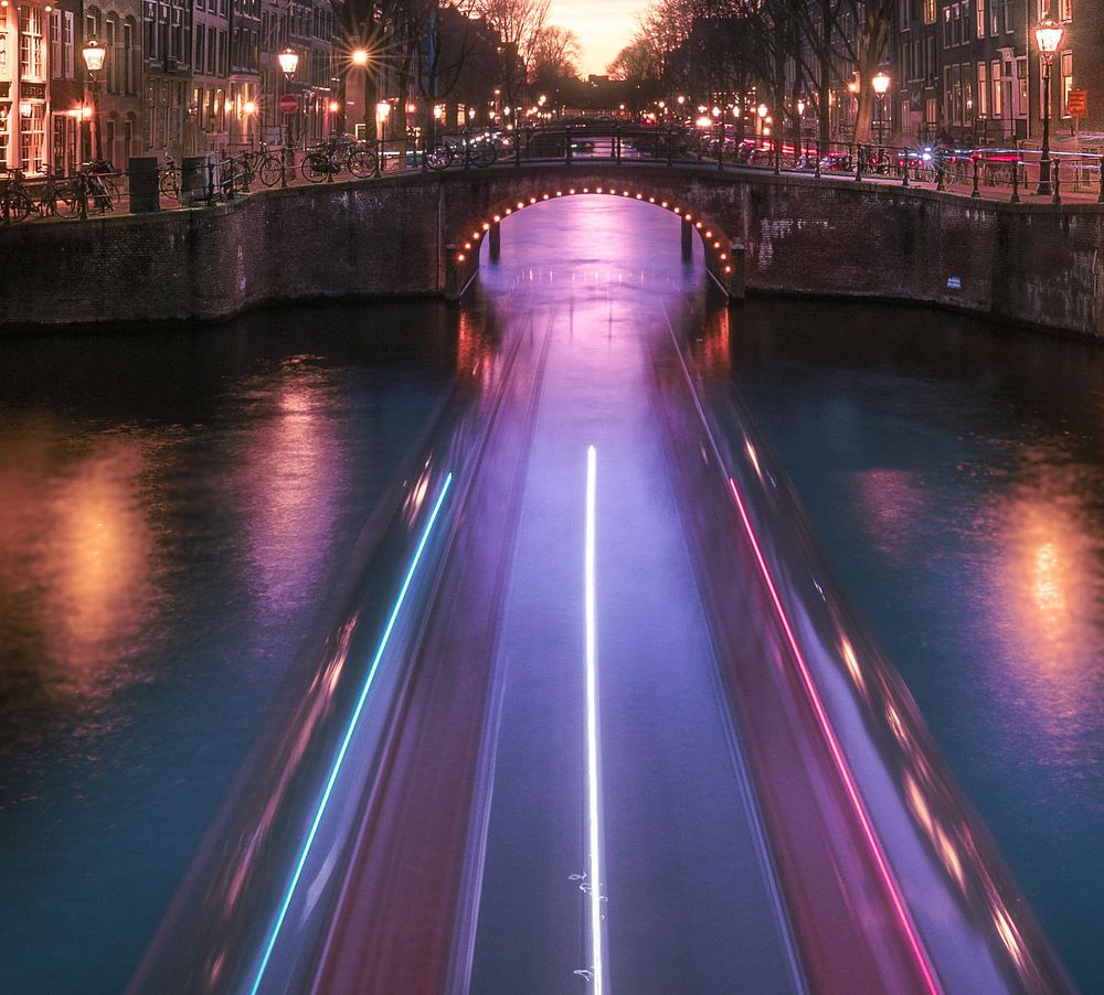 Lichtsporen van een toeristenboot die onder een brug doorvaart in de grachten van Amsterdam tijdens zonsondergang. Boottochten zijn een van de hoogtepunten tijdens een bezoek aan Amsterdam.