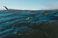 Deze foto vangt het moment waarop mens en zee elkaar ontmoeten in pure beweging. De golf neemt het beeld over terwijl een surfer bijna volledig uit zicht verdwijnt. Een vluchtige seconde waarin kracht, vrijheid en overgave samenkomen.