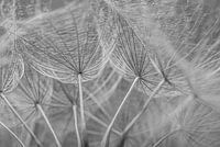 "Onder de dandelion (zwart-wit)" is een macrofoto van de pluisjes van een morgenster. Door het "kikvorsperspectief"