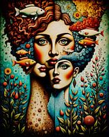 Mijn schilderij komt tot leven onder het oppervlak van de oceaan, waar licht danst door kabbelende stromingen en leven gedijt in verborgen symfonieën. Het is een visuele ode aan de stadia van het bestaan, gepresenteerd als een vrouwengezicht dat in werkelijkheid wordt gevormd door drie met elkaar verstrengelde gezichten. De drie delen van het schilderij staan voor jeugd, volwassenheid en leeftijd, en ze laten zien hoe de tijd verstrijkt, en onthullen dat we allemaal zijn wie we waren, wie we zijn en wie we zullen worden - een mix van alle momenten die we hebben gehad, de keuzes die we hebben gemaakt en de groei die we hebben doorgemaakt.Ik heb er bewust voor gekozen om het onder water te schilderen, omdat de diepe oceaan staat voor de verborgen delen van ons leven - de stille, onzichtbare stromingen van groei en vernieuwing die ons van binnenuit vormen. De vissen kronkelen door het water en dragen verhalen over de vluchtige vreugden en uitdagingen van het leven, terwijl de waterplanten zich uitstrekken en wiegen, veerkracht tonen en zich aanpassen aan de veranderende getijden.In het hart van het werk neemt een subtiele levensboom de vorm aan, die de gezichten in deze onderwaterwereld met elkaar verbindt.Het spreekt over onze gedeelde menselijkheid, het universele ritme van het bestaan en de met elkaar verweven draden van de diversiteit van het leven. Het is een stuk dat zowel diep persoonlijk als universeel is, en het nodigt je uit om na te denken over je eigen reis onder de oppervlakte.