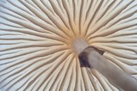 Macrofoto genomen van de onderkant van een porseleinzwam, zodat de lamellen goed zichtbaar zijn.
