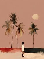Een minimalistisch tropisch tafereel van een silhouetfiguur onder hoge, wiegende palmbomen. De warme zand- en roesttinten, gecombineerd met het zachte roze van de lucht, creëren een serene vakantiesfeer. Een tijdloos kunstwerk dat rust en warmte in ieder interieur brengt.