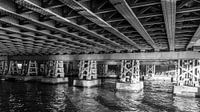 Een zwart wit beeld van de spoorbrug vlakbij Amsterdam Centraal, de westertoegang.
