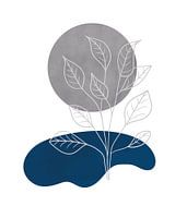 Minimalistisch landschap met een lijntekening van een plant in zilverkleurige inkt, en twee vormen van een meer in donkerblauw en een maan in zilver-grijs. De twee vormen zijn met aquarelverf geschilderd met een typische textuur.