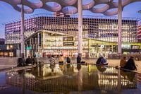 Op het Utrechtse stationsplein rusten mensen uit onder het bollendak. Vanuit het Centraal station loop je via het stationsplein naar het winkelcentrum Hoog Catharijne.
