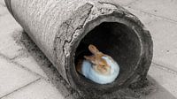 Een oranjewit konijn vond onderdak, een rustplaats, in een betonnen afvoerbuis die daar lag. De foto maakte ik bij een kinderboerderij denk ik, in Amsterdam Noord. Het was niet allemaal van steen. Het was verder een warme dag, en dit konijn lag verder lekker te soezen in de schaduw van het binnenste van die buis. Ik vind het wel…