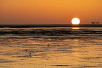 Ondergaande zon boven de Waddenzee nabij Moddergat Met vogels en booreiland.
