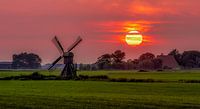 Molen in de rood ondergaande avond zon in het Friese landschap.