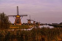 Windmolens aan de Kinderdijk gefotografeerd bij de ondergaande zon met avondkleuren in de lucht.
