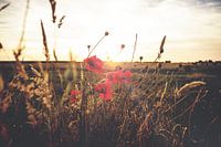 Zonsondergang met romantische setting en vintage kleuren. De zonnestralen komen tussen de rode klaprozen door en geeft een schilderachtig effect aan de foto.