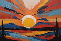 Dompel jezelf onder in de betoverende schoonheid van deze impressionistische interpretie van de laatste lichtstralen van de dag. Het canvas komt tot leven met de levendige penseelstreken die de ondergaande zon en de reflecterende wateren vastleggen, een oase van kleur creërend die de ruimte opwarmt met zijn oranje, rode, blauwe, gele en…