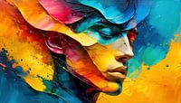 In dit expressieve en kleurintensieve kunstwerk, dat doet denken aan de zeggingskracht van een schilderij, komt het zijprofiel van een man tevoorschijn uit een rijkelijk aangebrachte verflaag. Zijn gezicht lijkt letterlijk tevoorschijn te komen uit de dikke, impasto kleur - een sculpturale verschijning die oprijst uit de diepte van het schilderij. De ogen van de man zijn zachtjes gesloten, zijn hoofd lichtjes neergeslagen en stralen een aura van innerlijke kalmte en tevredenheid uit.