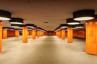 De foto toont een modern metrostation met een opvallend ontwerp. De architectuur wordt gekenmerkt door gelijkmatig verspreide, oranjekleurige kolommen bekleed met gladde tegels. De muren en plafonds zijn ook sterk oranje gekleurd, wat de ruimte een uniform en warm kleureffect geeft. Grote, ronde plafondlampen zorgen voor een gelijkmatige verlichting en benadrukken de geometrische structuur van het station. De vloer bestaat uit grijze tegels, die een duidelijk contrast vormen met het dominante kleurenschema van de kolommen en muren.