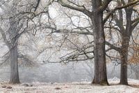 Een ijskoude mistige ochtend op de heidevelden van de Veluwe met drie eiken als bleke silhouetten in dit winterlandschap.