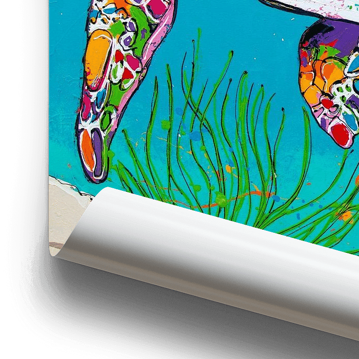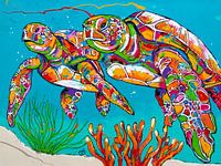 Onderwater knuffel: Duik in de rust met dit originele schilderij van twee zeeschildpadden die tussen kleurrijk koraal zwemmen. Een rustige, kleurrijke ontsnapping voor elke kamer.