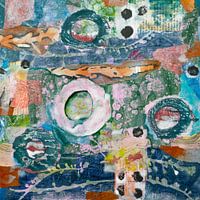 De dominante blauwe tinten roepen de diepte van de oceaan op, terwijl speelse accenten van turkoois, groen en warm bruin de levendigheid en beweging van een koraalrif uitdrukken. Verspreid over het oppervlak zijn abstracte cirkels en organische vormen die de kijker uitnodigen om te verdwalen als een duiker in een eindeloze onderwaterdroom.