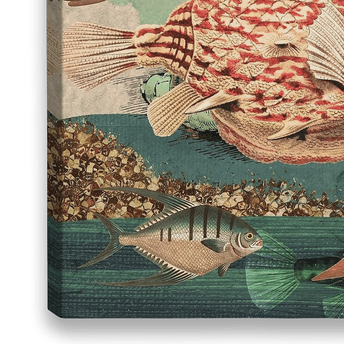 Het is druk onderwater. Allerlei tropische vissen uit oude prenten vormen in deze collage de voorgrond. In de achtergrond een aantal schetsen van andere marine levensvormen.