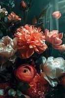 Dit kunstwerk toont een betoverende onderwaterscène met weelderige bloemen zwevend in een teal-gekleurde diepte. Een opvallende koraalkleurige pioen staat centraal, omringd door witte rozen en vurige ranonkels. De bloemen zijn gedetailleerd weergegeven, met petalen die lijken te golven in onzichtbare stromingen. Lichtstralen filteren…