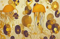 Een kleurrijk digitaal schilderij van onderwaterleven in te stijl van Gustav Klimt. Dit werk is geïnspireerd door de vormen en het kleurenpallet van "De Kus". Het werk geeft een warme en klassieke uitstraling aan uw interieur!