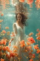 Een etherische onderwaterfoto waarin een zwevende figuur in een luchtige witte jurk wordt omringd door koraalkleurige bloemen tegen een turquoise achtergrond. Het spel van licht en luchtbellen creëert een dromerige sfeer, terwijl het haar en de stof mysterieus in het water dansen. De compositie balanceert perfect tussen surrealistische schoonheid en een inpiratie op onderwaterfotografie.