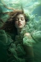 Een etherisch kunstwerk waarin een serene compositie wordt gevangen in een zee van mintgroene zijdeachtige stoffen. De zwevende, dromerige sfeer wordt versterkt door de vloeiende beweging van het textiel en het zachte licht dat door de lagen heen sijpelt. Het beeld ademt een tijdloze rust en mysterieuze diepte uit, waarin de toeschouwer wordt meegevoerd in een onderwaterwereld van zachtheid en gratie.