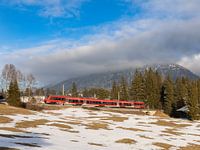 Een idyllisch tafereel, de trein rijdt door het prachtige landschap van Opper-Beieren. Blauwe lucht, opvallende wolken, bergen, bomen en nog wat sneeuw. Een zonnige dag in februari in de buurt van Krün.