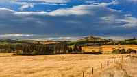 Onderweg in nieuw-Zeeland en een landschap in warm ochtendlicht. Gezien en gemaakt tussen Te Anau en Invercargill op het Zuidereiland van nieuw-Zeeland.