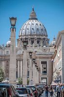De straat leidt je bijna vanzelf naar de imposante koepel van de Sint-Pieter. Auto’s, wandelaars en de rij klassieke lantaarns vormen een sterk lijnenspel dat je blik dieper het beeld in trekt. Juist in de kleine details – het licht op de stenen, de schaduwen langs de pilaren – ontstaat de echte sfeer.