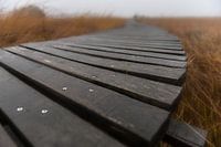 Een wandelpad in de Hoge Venen in de Belgische Ardennen verdwijnt in de mist. Uit de mist doemt steeds opnieuw een langere weg op. Onderweg naar nergens