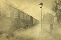 Een jonge vrouw op een station met een oude trein met vele wagons in de mist, met fijne textuur en sepiatoon.