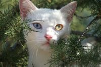 Een wit, ondeugend poesje kijkt je aan vanuit een conifeer