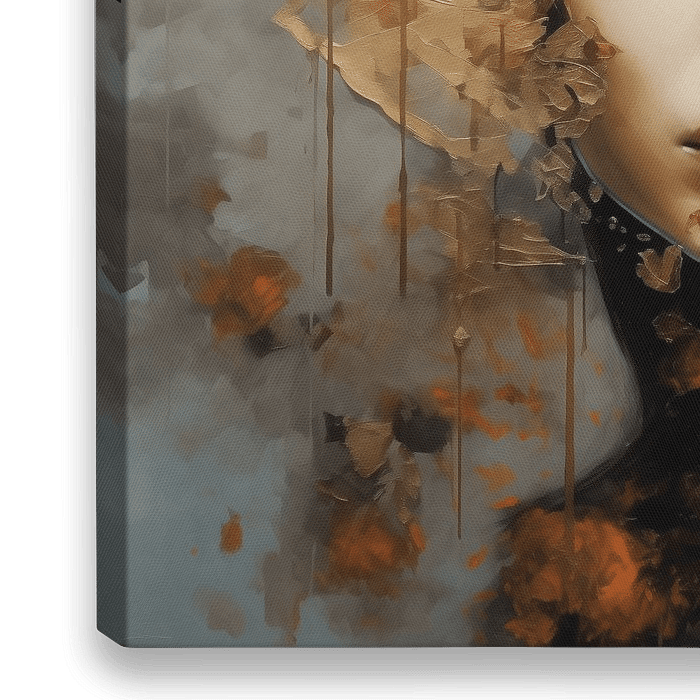 Surrealistisch portret van een vrouw in voornamelijk goud,oranje en grijs tinten met een grove textuur.