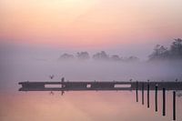 Een steiger met (opvliegend eend) en vogels voor zonsopkomst. De lucht is pastel. Locatie: Leekstermeer.