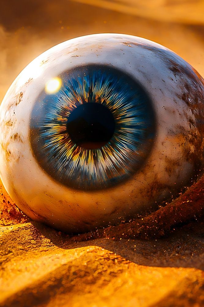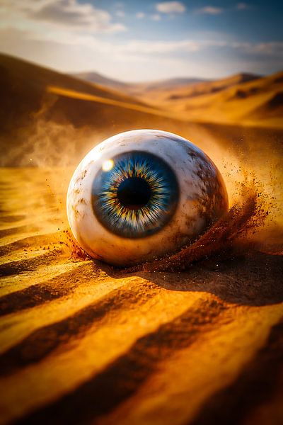 Een eenzaam glazen oog rolt door de eindeloze woestijn, voortgeduwd door een onzichtbare kracht. Het glanst in het warme licht van de ondergaande zon, terwijl zandkorrels opspatten en als een gouden waas om zijn ronde vorm heen dansen. De iris – diepblauw met tinten van groen en amber – lijkt alles te zien: de golvende duinen, de verre…