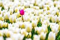 Een prachtige roze tulp steekt fier boven zijn witte soortgenoten uit in een tulpenveld.