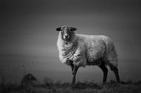 One sheep in the heather. Appelscha, the Netherlands. Horizontal in black and white. 2018.