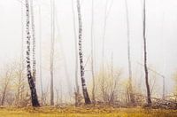 Drie berkenbomen in een mistig bos in Nederland op een sfeervolle ochtend in warme goud gele tinten.
