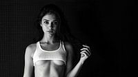 Deze zwart-witfotografie straalt kracht en puurheid uit door zijn eenvoud. Het beeld toont een jonge vrouw die recht in de lens kijkt, zonder omwegen, zonder maskers. Haar donkere ogen ontmoeten die van de kijker met een mengeling van vastberadenheid en kwetsbaarheid. Het witte topje dat ze draagt contrasteert fel met de donkere…