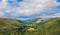 Wijds zicht op de ongerepte natuur in de Schotse Hooglanden. Veel groen en weinig bebouwing.