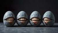 Dit surrealistische kunstwerk prikkelt de verbeelding met zijn unieke mix van humor en mysterie. Vier ei-achtige objecten, gemaakt van een ruwe, grijze textuur, staan symmetrisch naast elkaar op een donkere ondergrond. Wat direct opvalt, is dat deze "eieren" voorzien zijn van geopende ritsen waar menselijke tanden achter schuilgaan. De…