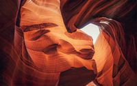 De golvende vormen van Antelope Canyon zijn als een betoverende dans van licht en schaduw, uitgehouwen door miljoenen jaren van natuurlijke erosie. Deze smalle kloof, gelegen in het rotsachtige landschap van Arizona, Verenigde Staten, is een meesterwerk van zandsteen, met gladde, golvende muren die organisch lijken te stromen als golven in een denkbeeldige zee.