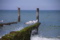 Golven spatten op tegen de golfbrekers waar zee meeuwen uitrusten op een mooie zomerse dag in Zeeland