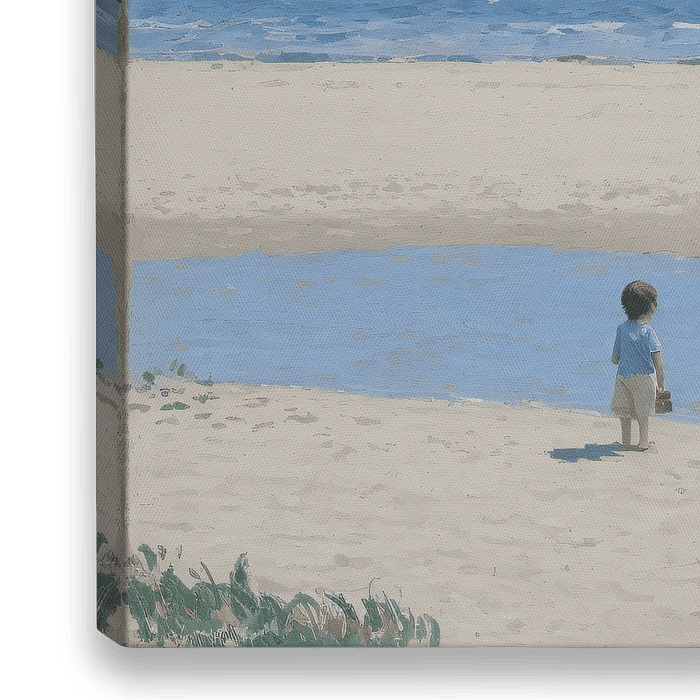 Hier zien we een klein kind dat naar de verre horizon staart, alsof hij droomt van avonturen die nog moeten komen. De oneindige blauwe lucht en de golven die zachtjes aanspoelen, brengen een gevoel van onschuld en oneindige mogelijkheden. Dit herinnert me aan mijn eigen jeugd, vol dromen en verbeelding.