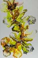 Abstract schilderij met de lente als inspiratiebron. De tijd dat je de bomen in blad ziet springen en als bij toverslag alle bloemen open lijken te staan. Fris, vrolijk en levendig in tinten lime groen, geel, bruin, koper en goud op een zachtgrijze ondergrond.
