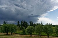 Een groot grijs, dreigend uitziend stormfront nadert, de zon schijnt nog op de locatie, bomen en weilanden op de voorgrond - Locatie: Duitsland, Brandenburg, Oder, Oderbruch
