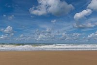 Mooie hoge golven in de Noordzee aan het strand. Prachtige blauwe lucht met indrukwekkende stapelwolken.