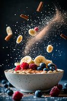 Zwevende plakjes banaan en sprankelende kaneel creëren een magische sfeer die de eetlust stimuleert en de ochtend opfleurt. De levendige kleuren van de bessen brengen frisheid en levensvreugde in elke kamer. Dit schilderij is ideaal voor in de keuken en geeft elke ontbijttafel een uitnodigende sfeer en inspirerende energie voor de dag.