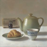 Ontbijttafel | Morning Calm - Dit stilleven schilderij toont een rustige ochtend met een groene theepot, een kopje, een croissant op een bord en een krant op een tafel, alles badend in zacht licht.
